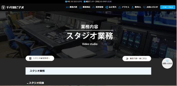 お問合せ | 電話番号:スタジオ・中継車などのスケジュール、料金に関するお問合せ :03-3215-2741 技術・撮影機材に関するお問合せ:03-3212-1878 編集・MAに関する問合せ:03-5457-2131 採用・その他全般に関する問合せ:03-3214-5958 お問合せフォーム:https://www.chiyoda-v.co.jp/inquiry/ |